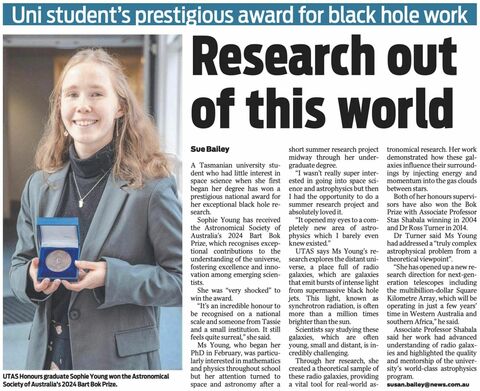 Sophie's recognition highlights her exceptional research and reflects the strength and impact of the University of Tasmania’s astrophysics program.